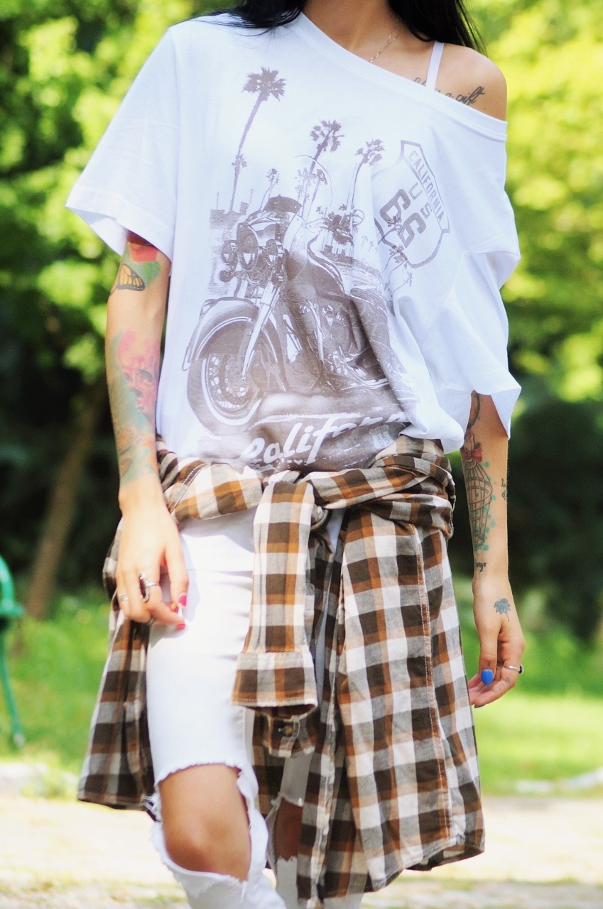Dziś kolejna stylizacja z męskim t-shirtem od bonprix. TUTAJ możecie zobaczyć jak skomponowałam ostatnią moją stylizację, w której również miałam na sobie męską koszulkę. Tym razem górę zestawiłam z białymi, podartymi jeansami, oversizową koszulą przewiązaną w pasie i białymi trampkami. Całość jest luźna i wygodna, doskonała zarówno na spacer jak i na shopping :). T-shirt znajdziecie TUTAJ.
