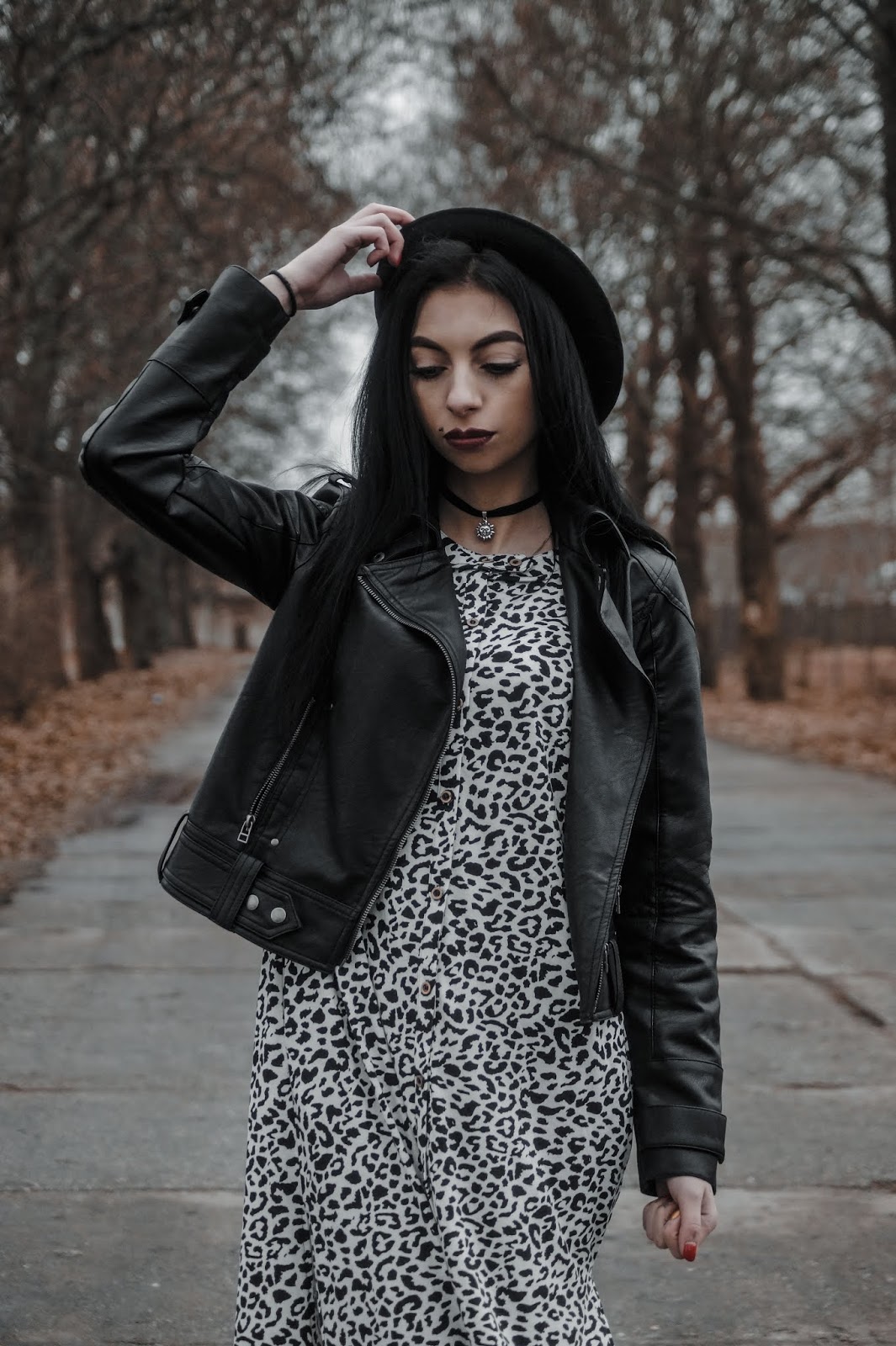 Moi drodzy witam Was wszystkich w ten piątkowy wieczór!:) Jak zaczął się Wasz weekend, mój zacznie się dopiero jutro wieczorem, bo jeszcze czeka mnie dzień na uniwerku. A jak minął Wam ten tydzień? Mój był taki szalony, że nie miałam praktycznie czasu na nic i kolejny nie zapowiada się wcale lepiej :p. Ok, ale przejdźmy do stylizacji. Dzisiejszy look jest inspirowany modą lat 90 oraz grungem, do którego mam ogromny sentyment. Długą sukienkę w panterkę połączyłam z klasyczną, czarną ramoneską, do tego wiązane botki, kapelusz oraz choker. Sukienkę ze zdjęć znajdziecie w sklepie Kate Kasin - TUTAJ.