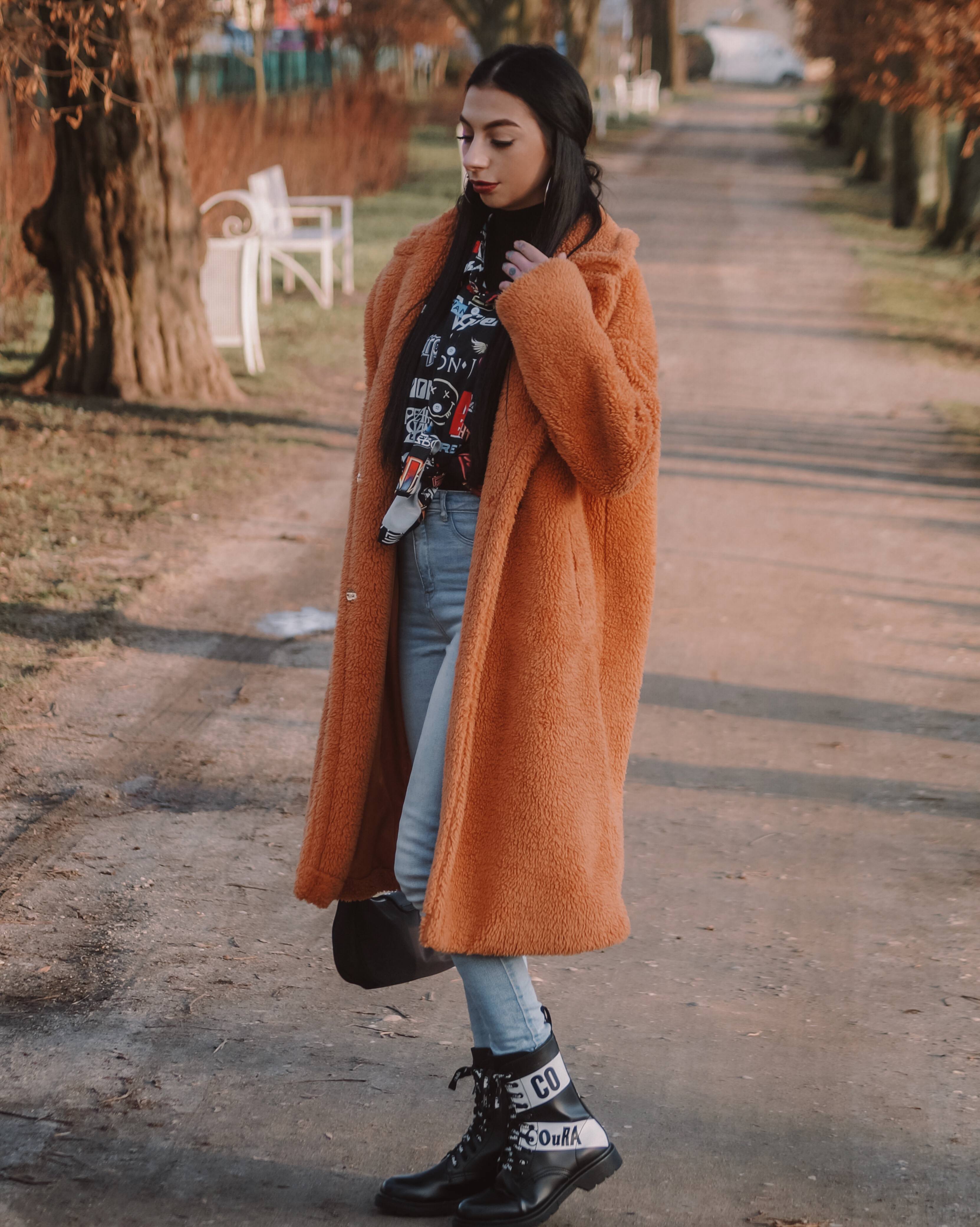 Co tam u Was słychać? Ja dziś totalnie poczułam wiosnę! Cały dzień świeci słoneczko, aż inaczej się funkcjonuje. Co do samej stylizacji to mam na sobie długi, pomarańczowy płaszcz, do tego klasyczne jeansy, koszula vintage oraz czarne workery, które są ze sklepu czasnabuty.pl.